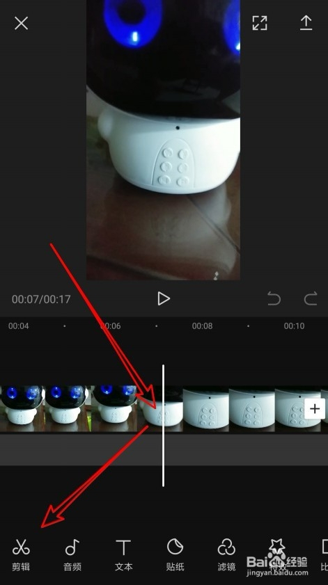 接下来就会打开剪映的编纂页面了,首先定位到要朋分视频的位置,然后点击东西栏上的“剪辑”按钮。