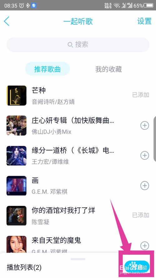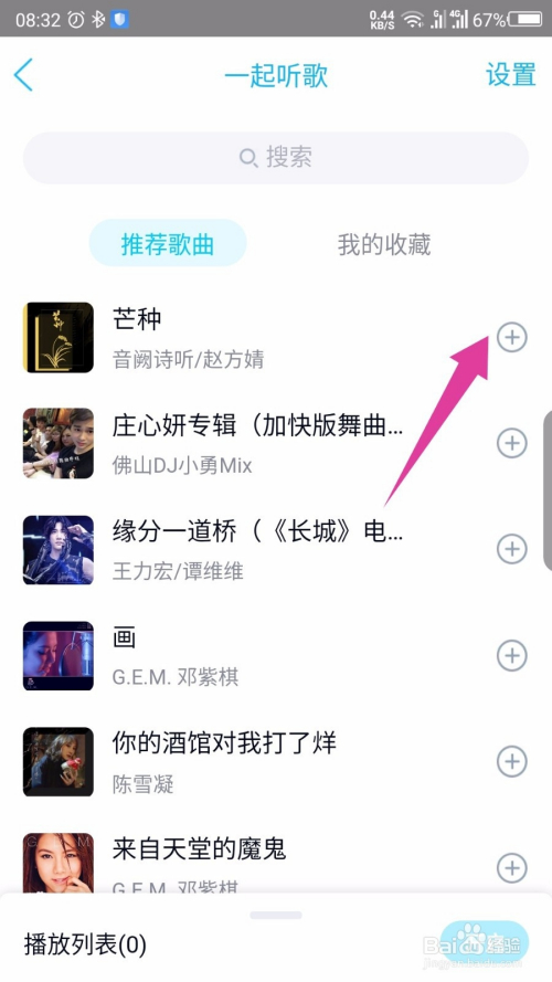 在打开的一路听歌界面,选摘要听的歌,点击后面的加号。如图所示