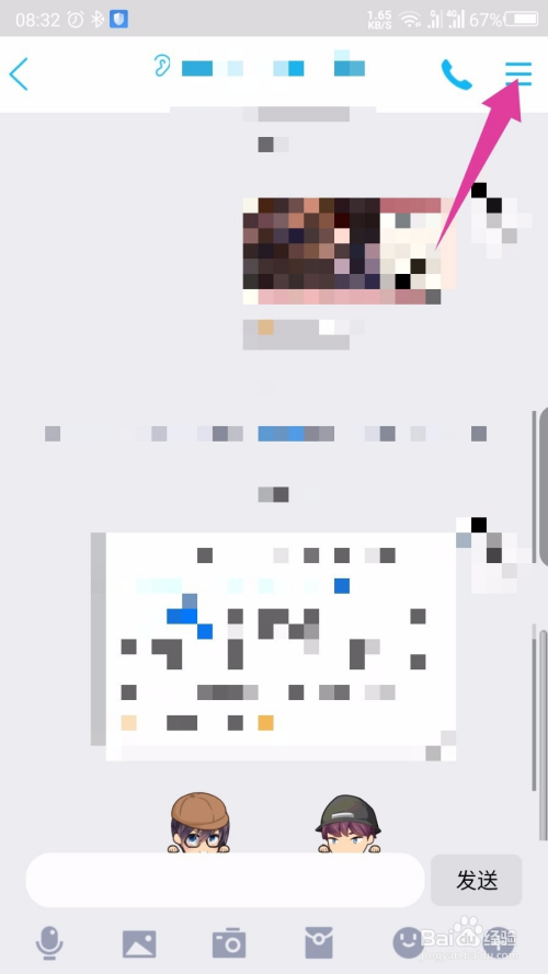 在老友聊天窗口中,选择右上角三图标。如图所示