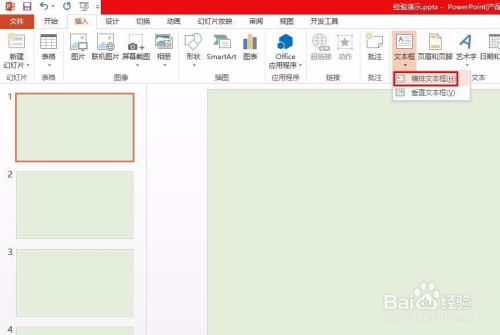 第一步:打开一个ppt,单击选择菜单栏中的“插入--横排文本框”。