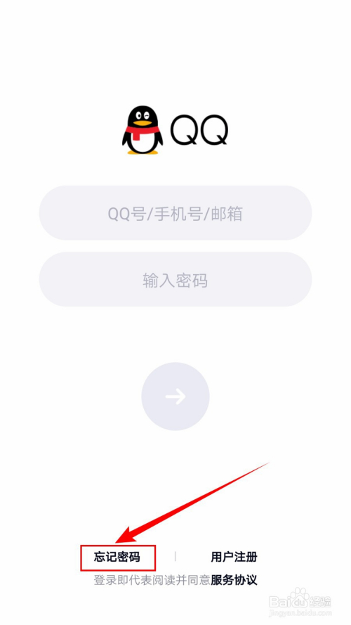 手机打开QQ,在登录页面点击【健忘密码】,在弹出的选项中选择【找回密码】,进入“输入账号”页面。