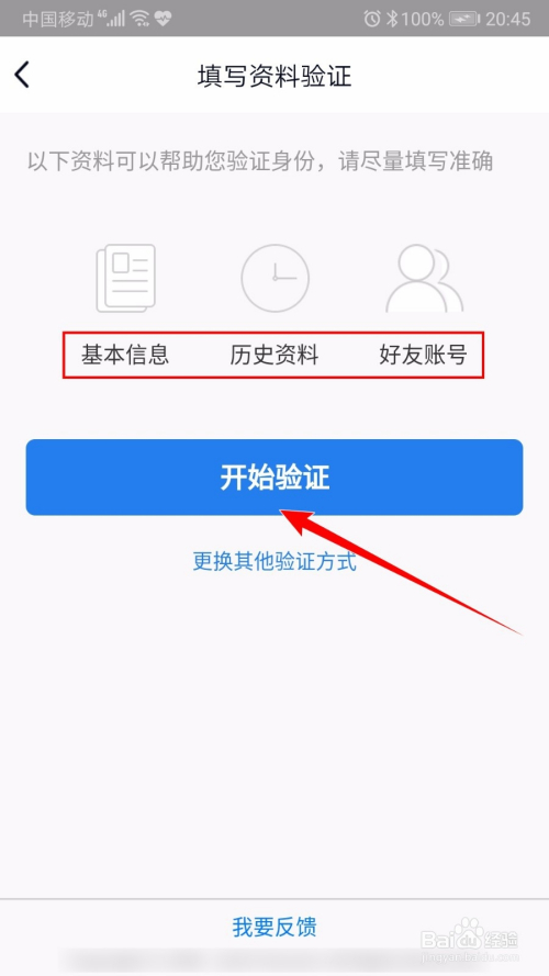 可以经由过程根基信息、汗青资料和洽友账号来验证身份。单击【起头验证】按钮。