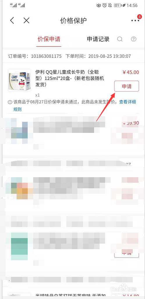 进入价钱庇护中后,可以查看到比来采办的商品,点击申请按钮即可,期待一段时候就会呈现审批成果