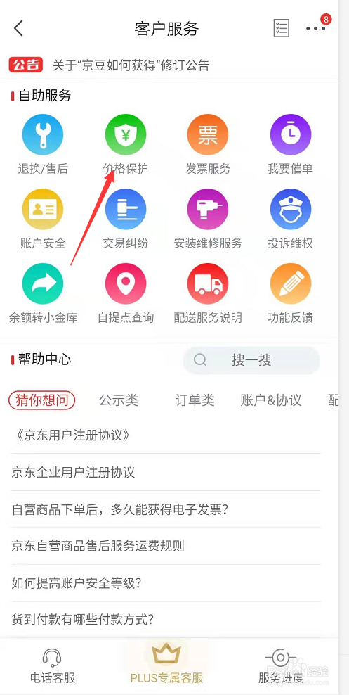 进入到客户办事详情功能中,在页面中部找到价钱庇护选项,点击进入