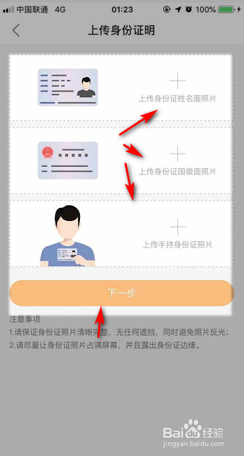 进步前辈行账号验证后,上传小我的身份证实后,点击下一步