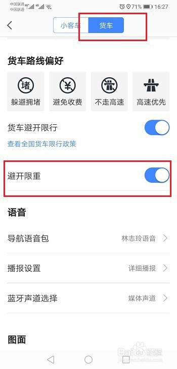 第四步在导航设置界面,点击货车,首先要添加本身货车的信息,添加之后,开启避开限重项,如下图所示: