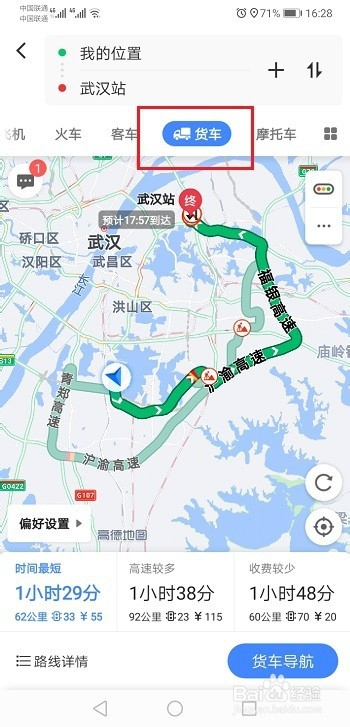 第五步开启货车避开限重之后,搜刮路线的时辰,选择货车路线,这样就避开 货车限重了,如下图所示: