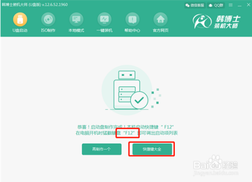 在颠末一些简单的步调后弹出提醒U盘已经建造完当作了,而且提醒我们电脑启动U盘快捷键是哪个。(若是不是本电脑利用,也可以点击快捷键大全,看本身电脑品牌或本家儿板快捷键是哪个)