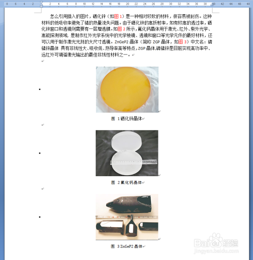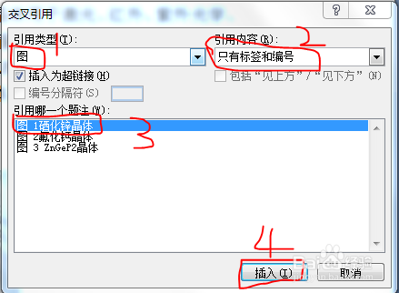 接下来主动弹出“交叉引用”选框,引用类型选择【图】,引用内容选择【只有标签和编号】,在引用哪一个题注里面选择【图1 硒化锌晶体】,然后点击【插入】。