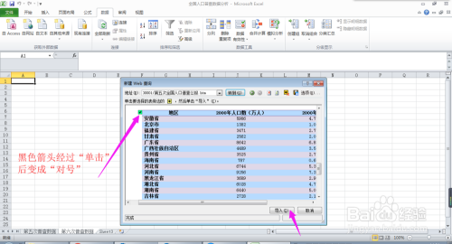 点击要导入的表格旁边的带方框的黑色箭头,使黑色箭头酿成对号,接着点击对话框下方的【导入】按钮,弹出【导入数据】对话框,选择数据的放置位置,点击【确定】,表格导入完当作。