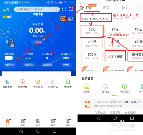 首先小编这里是已经下载安装并利用手机注册登录了联通手机营业厅,点击手机上的联通手机营业厅——点击首页——充值中间——选择:手机——输入腾讯大王卡号——选择一种固定面额的话费。Tips:也可以点击自界说金额或积分交费