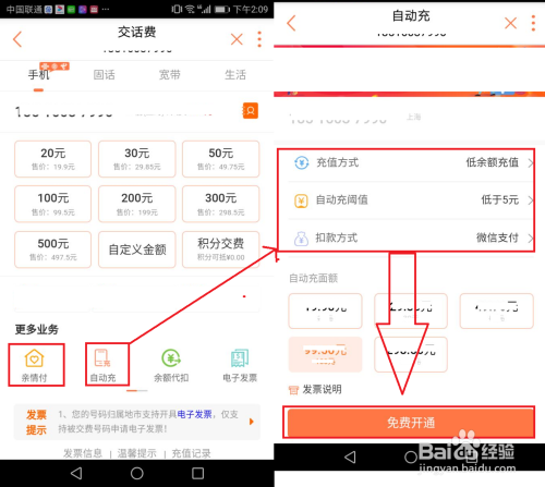 Tips:为了防止家人的手机停机无法正常与家人联系,可以选择亲情付。也为了让本身手机避免欠费,可以点击开启:主动充——设置主动充有关选项及充值面额——点击免费开通。