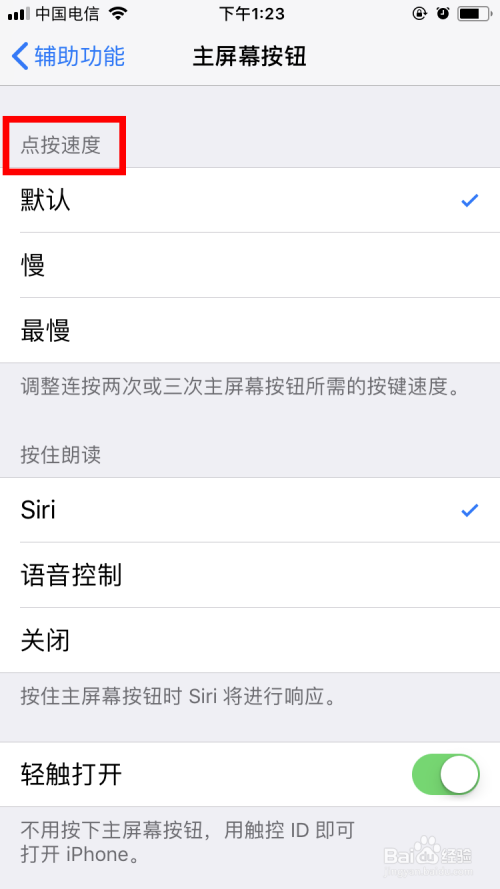 进入 本家儿屏幕按钮 的界面后,可以看到第一个项目就是 点按速度 。系同一般是默认速度。