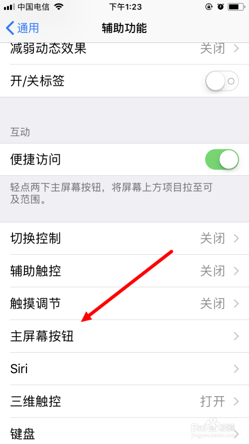 接着,在 辅助功能 的界面里面,点击 本家儿屏幕按钮 。