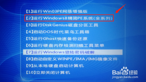 在U盘启动界面选择【2】运行Windows 8精简PE系统(全系列)并回车。