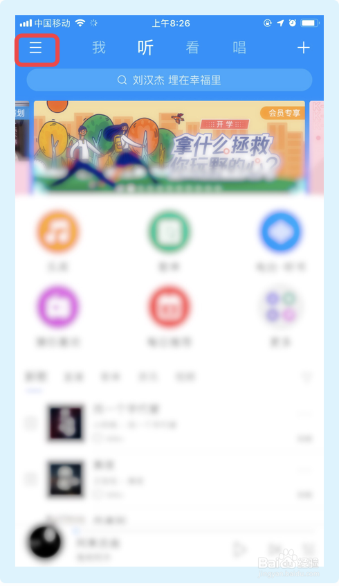 打开酷狗音乐app,选择并点击左上角的菜单选项,如下所示:
