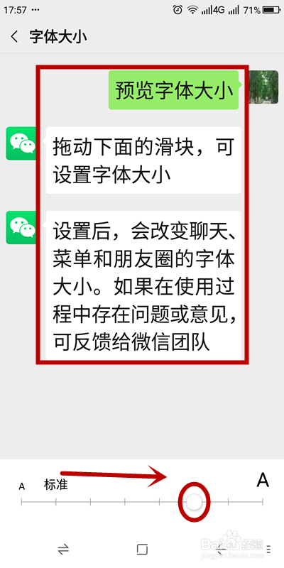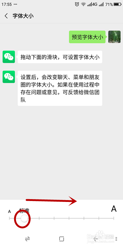 在“字体大小”界面,可以看到最下面的拖动轴。在这个数轴上的尺度位置从左往右越来字体越大,反之字体味越来越小。我们想变大字体,就标的目的右拖动这个圆点