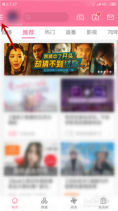进入哔哩哔哩后,点击左上角的【三】选项。