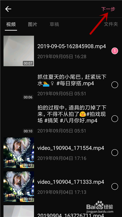 在视频界面勾选视频,点击【下一步】选项。