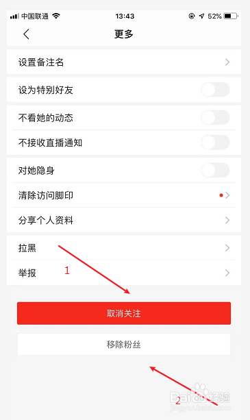 点击【打消存眷】在点击【移除粉丝】(这样就能完全删除老友了!若是你还不想对方在此看到你的资料可以选择拉黑!)