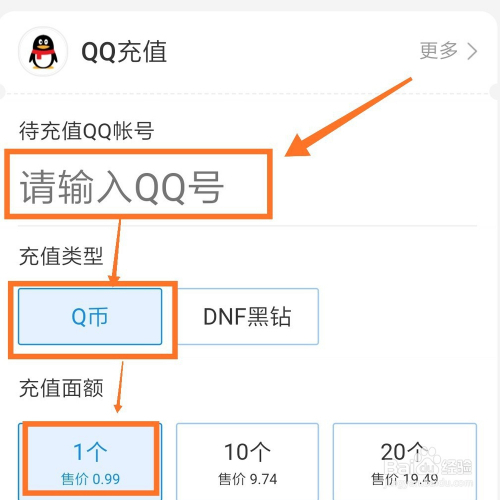 之后,我们在页面中,填上本身的QQ号,之后选择充值类型中的Q币,再选择充值面额中的面额(本次以一元为例)。