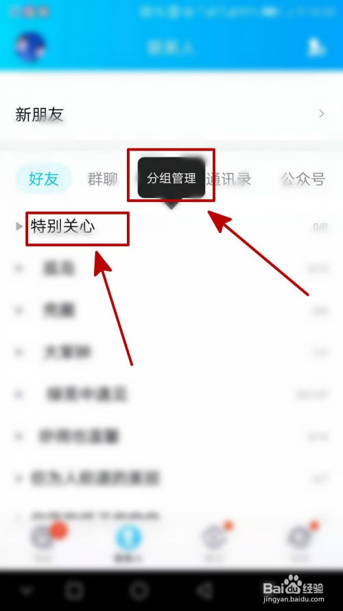 点击【联系人】,点击【老友】,可以看到已有的分组