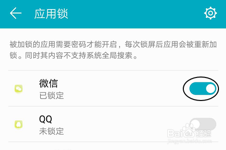 进入到应用锁界面,将需要加密的应用右侧开启设置为开启,见图一...这样别人即使点击了应用图标也是需要验证密码或者指纹才能进入;