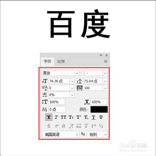 在字符面板,我们可以调整文字的字体和大小,如图所示。
