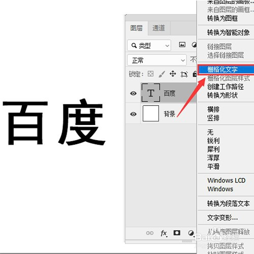 在图层面板,右击文字图层选择栅格化文字,如图所示。