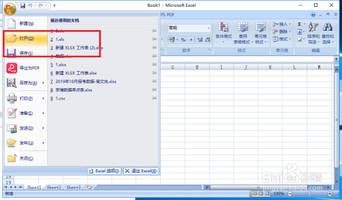 第四步打开excel2007应用,点击文件->打开,进行打开第二个excel文件,也就是2.xls文件,如下图所示: