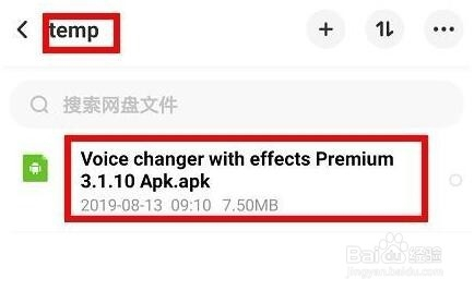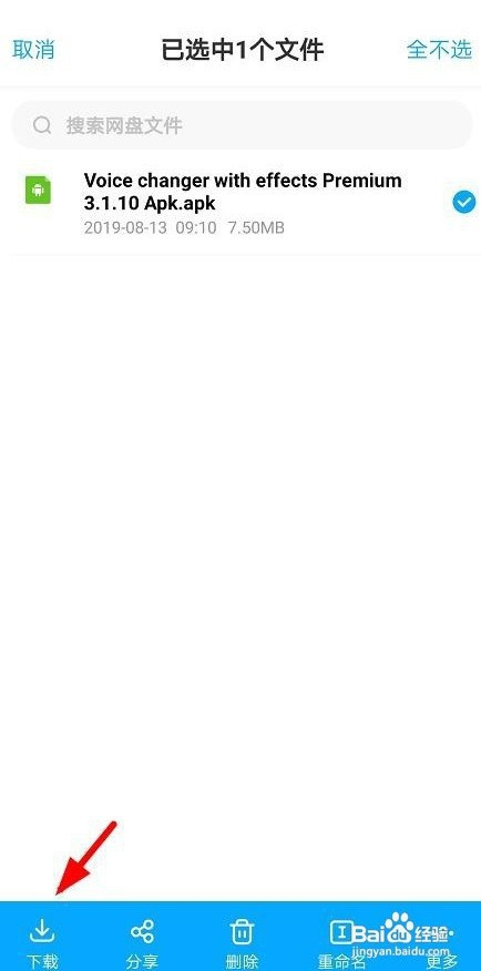 1进入手机百度网盘temp文件夹下,长按一个文件,点击下图红色箭头所指位置下载该文件。