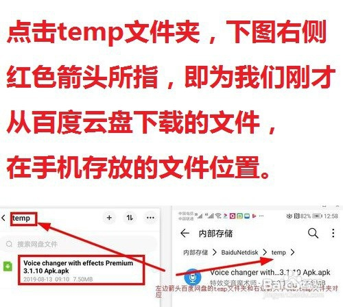 点击temp文件夹,下图右侧红色箭头所指即为我们适才我们从百度云盘下载的文件在手机存放的文件。