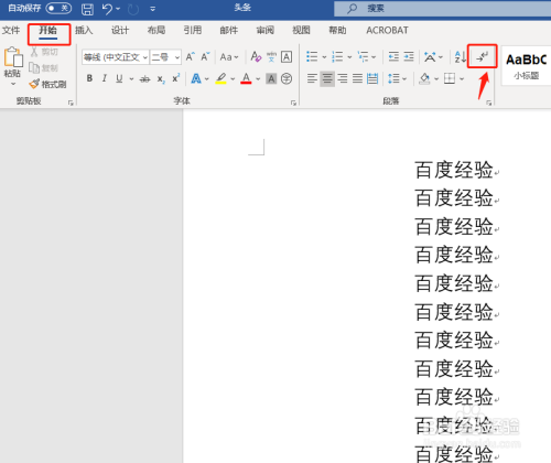 点击菜单栏中的“起头”,找到“显示/埋没标识表记标帜”,如图