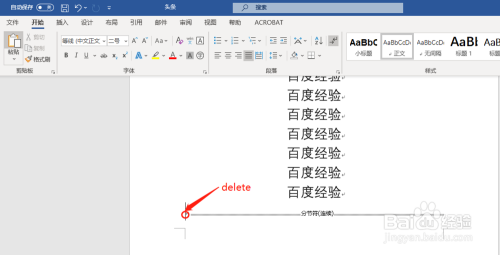 光标移至“分节符”的最左端,按键盘上的“delete”按钮即可删除,如图