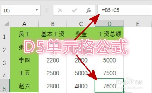 点击D5单位格,可以看到公式响应的变为=B5+C5。