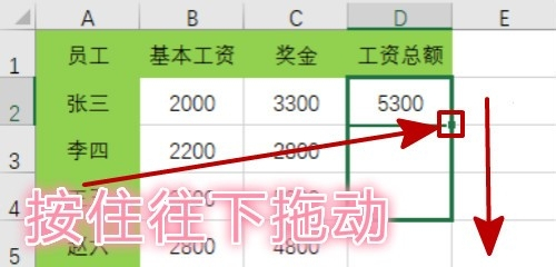 点击D2单位格,鼠标左键按住D2单位格右下角的小方格,往下拖动,进行公式复制填充,所有员工的“工资总额”全数完当作。