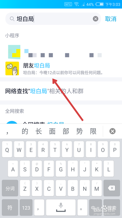 2、输入“率直局”并搜刮,点击成果中的“伴侣率直局”。