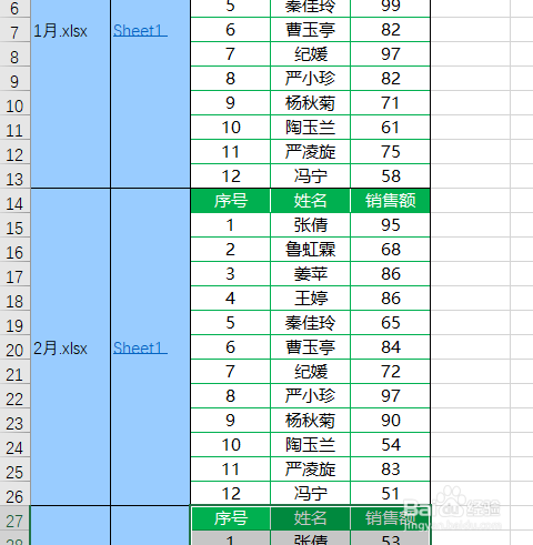 如下图有三个工作簿,别离是1月,2月,3月的发卖表。此刻为了便利统计计较想要将这三个工作簿的内容提取复制到一张工作表中。