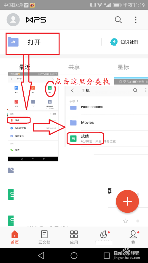 点击打开WPS——打开——手机——点击成就表格进行打开。也可以打开WPS后点击XLS,在EXCEL文件中去查找。