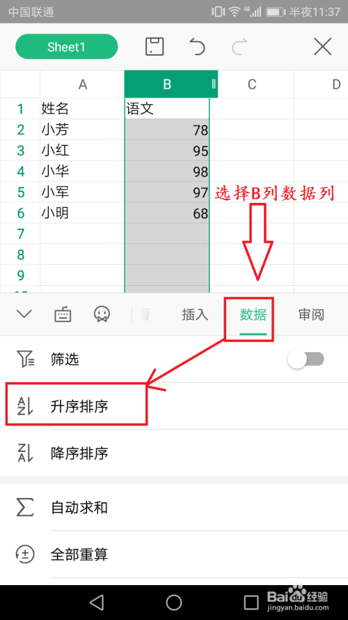以成就列为关头词进行排序:选择B列语文成就数据——标的目的左移动菜单,点击数据——升序排序。