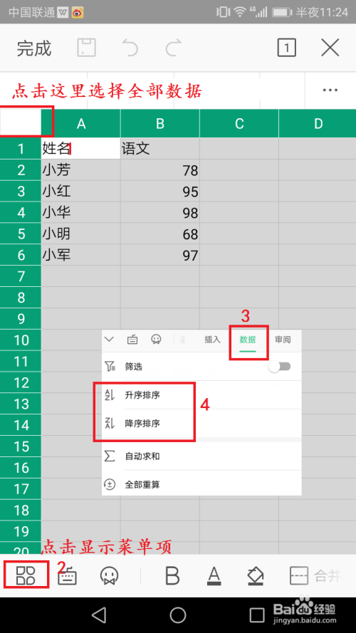 点击表格左上角行与列交叉处选择所稀有据内容——点击左下角的菜单图标,展示EXCEL菜单项——数据——选择升序排序或降序排序。这要选择全数排序只能以A列内容来进行排序。