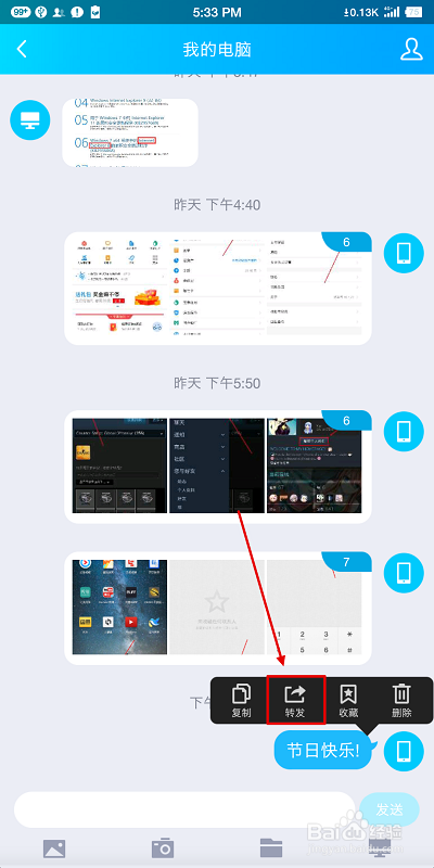 发送完当作“祝福语”之后,我们长按这条信息,选择【转发】。