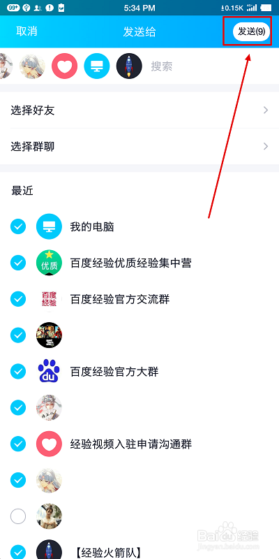 最后,在我们把“联系人”勾选完毕之后,再点击右上角【发送】选项就可以啦。