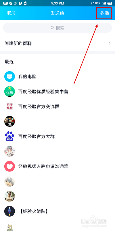 三、在“比来会话”界面中,我们点击选择“多选”功能。