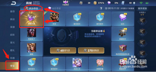 1、登录《王者荣耀》,进入商城的夺宝界面,利用荣耀积分抽奖获取荣耀水晶;