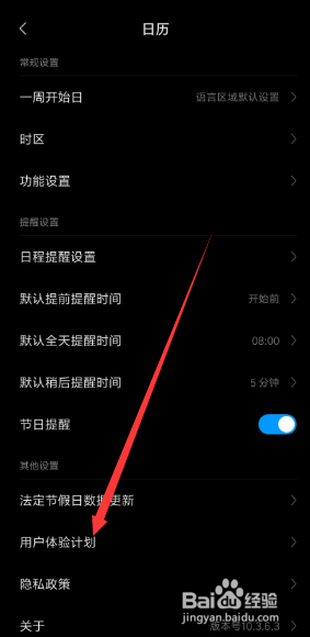 打开日历中的设置,然后点击用户体验打算,封闭告白推送即可