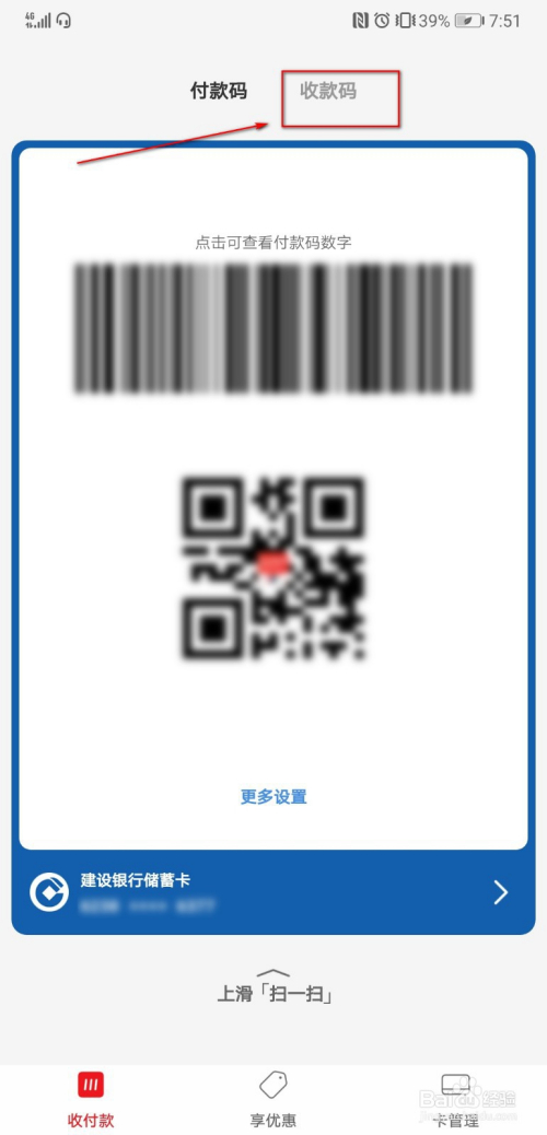 此时点击左下角的“收付条目”选项,则呈现了付条目时的二维码,付条目所利用的就是添加的银行卡账户