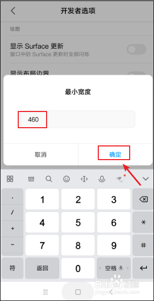 呈现“最小宽度”窗口,输入你要设置的dpi值,好比:460,再点击【确定】。