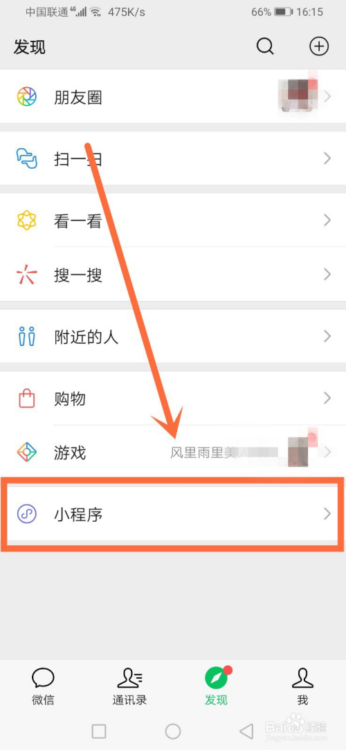 进入发现页面后,点击下小程序。如下图所示