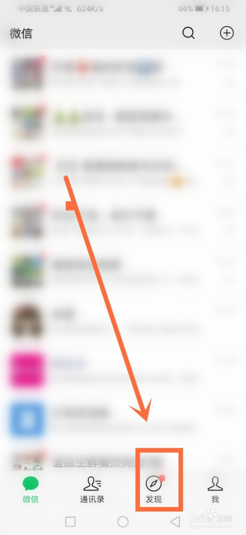进入微信首页页面后,点击下方的发现。如下图所示